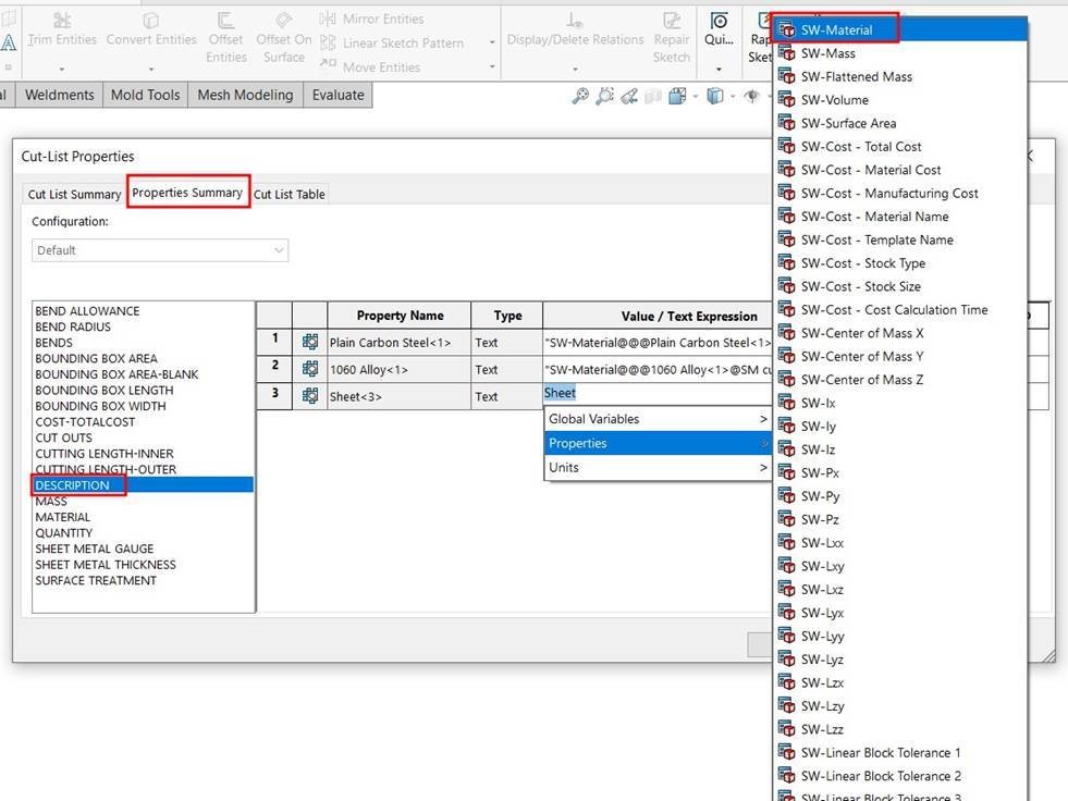 - In the Properties Summary section, locate Description and set it to SW-Material.