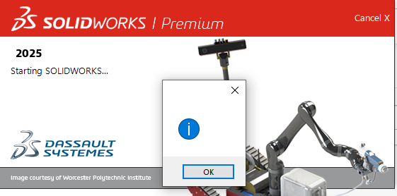 On launching SOLIDWORKS, a blank error window appears (with an exclamation icon) referencing missing or incorrect Hole Wizard/Toolbox path.