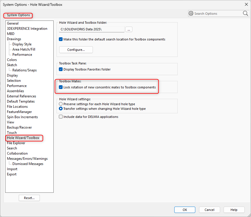 If the option is enabled, SOLIDWORKS automatically locks rotation of concentric mates with Toolbox components.