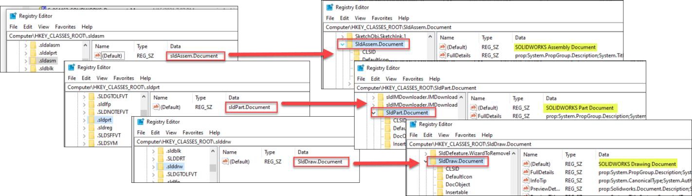 “HKEY_CLASSES_ROOT\.sldprt” extension should point to “HKEY_CLASSES_ROOT\SldPart.Document”