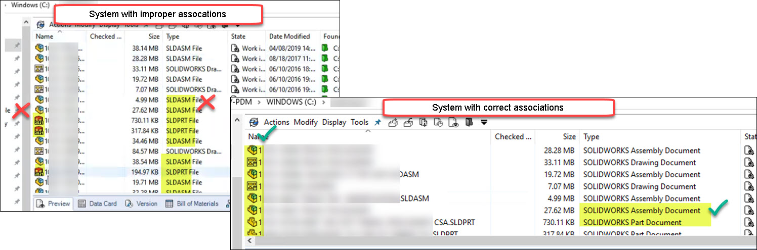 While missing or incorrect file type associations would still work in most circumstances, SOLIDWORKS PDM relies on the Windows API to show and handle file types – so it is important that the SOLIDWORKS file type associations in the registry are properly configured.