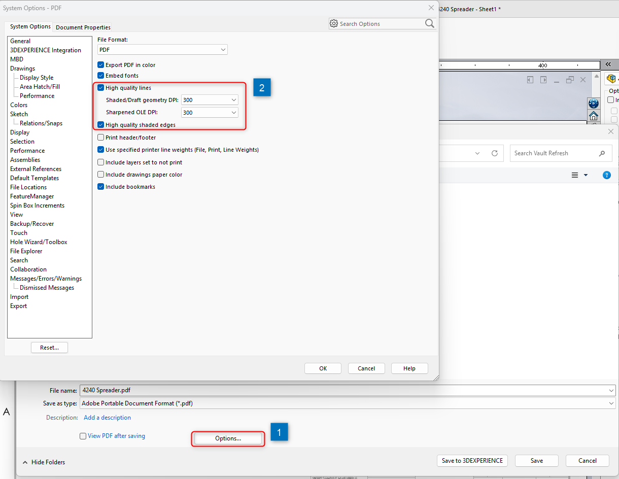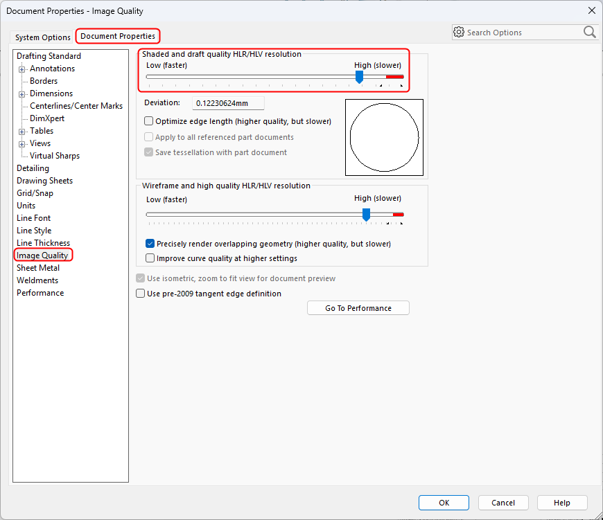 1. Open the drawing → go to Tools → Options → Document Properties → Image Quality → set to High Quality.